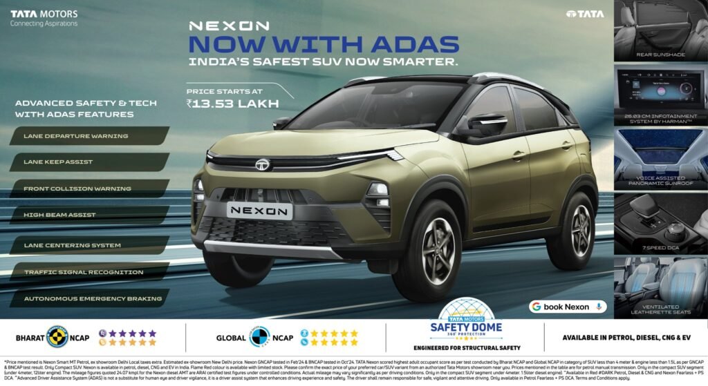 टाटा मोटर्स ने अपनी पॉपुलर एसयूवी Tata Nexon (टाटा नेक्सन) को अब और भी सुरक्षित और हाई-टेक बना दिया है। कंपनी ने इसमें लेवल 2 ADAS (एडवांस्ड ड्राइवर असिस्टेंस सिस्टम) फीचर्स जोड़ दिए हैं, जिससे ड्राइविंग अब पहले से ज्यादा आसान और सेफ हो गई है। नेक्सन भारतीय बाजार में सेफ्टी का दूसरा नाम बन चुकी है, यह देश की पहली कार है जिसने GNCAP और BNCAP दोनों से 5-स्टार रेटिंग हासिल की है।